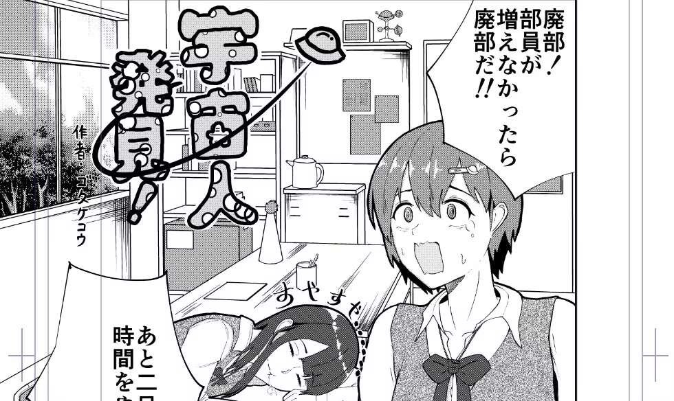 宇宙人の存在を信じている二人の女子高校生が、部員不足で廃部になりそうな自分たちの部活と部室を守るために、夜に撮ったぼやけたフクロウの写真を使って「宇宙人が現れた」というニュースを捏造し、新入部員を集めようとする話です。